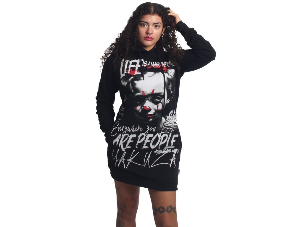 Dámské šaty s kapucí YAKUZA MASQUERADE V02. Šatů nikdy není dost, obzvlášť když jsou ideální pro ležérní styling: Ne příliš úzké, ne příliš volné, prostě tak akorát. Tyto šaty mají také kapuci se stahovací šňůrkou a švové kapsy, žebrovaný lem a manžety. Jsou doplněny úžasnými vintage potisky, logem Yakuza na bočním švu a gumovou nášivkou s logem u lemu. Sledujte prosím níže uvedené specifikace velikostí a pokyny k praní.