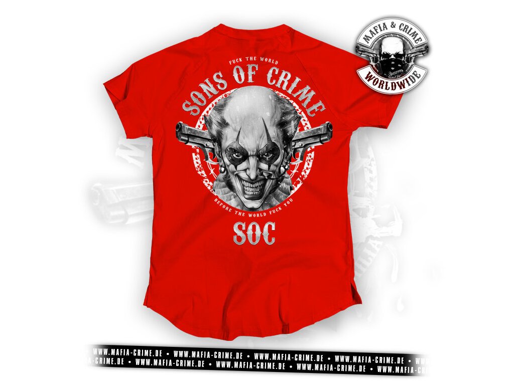 Jste připraveni něco říct? Naše tričko „Sons of Crime“ není pro slabé povahy. Výrazný přední potisk s nápisem SOC okamžitě ukazuje, za čím si stojíte: postoj, houževnatost, loajalita. Na zadní straně agresivní klaunský design se zkříženými zbraněmi a nezaměnitelný slogan „FUCK THE WORLD - BEFORE THE WORLD FUCK YOU“ zajistí maximální pozornost.