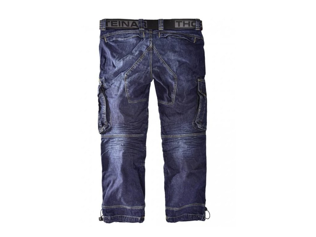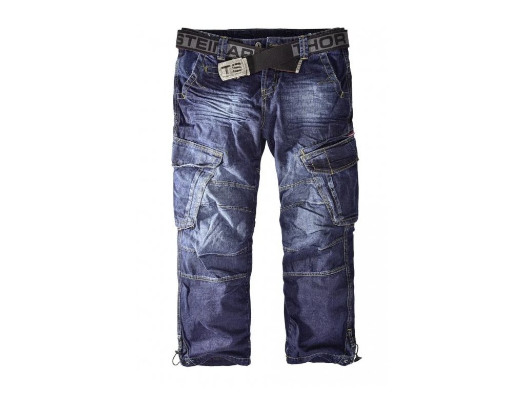 Robustní a trendy džínové cargo kalhoty Thor Steinar z kvalitní, odolné a trvanlivé těžké bavlny. Zadní kapsy, velké boční šikmo našité a uzavírané příklopkami a klasické boční. Tvarovaná kolena pro pohodlné sezení, zesílený sed, volnější střih s širší nohavicí. Spodní lem nohavic regulovatelný šňůrkou. Množství malých detailů.