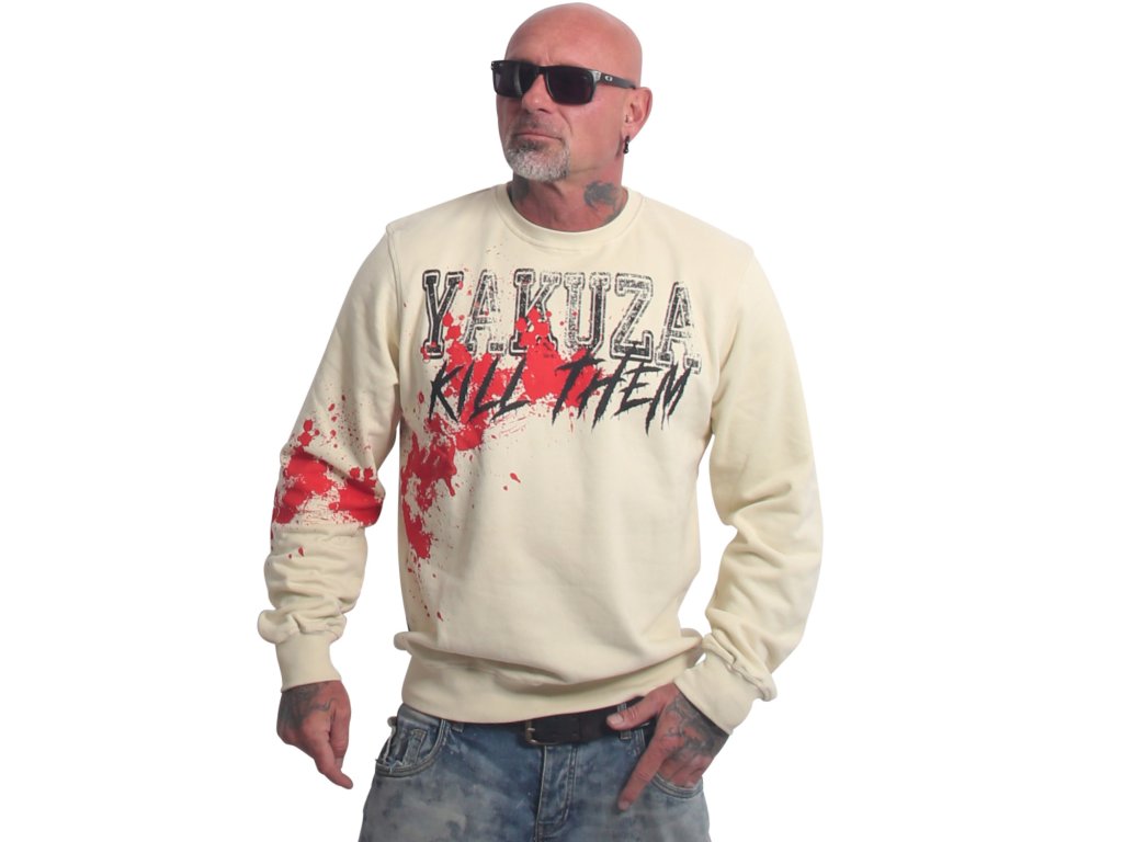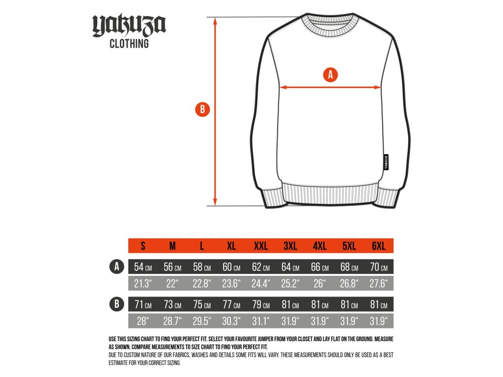 Pánská mikina YAKUZA HURT. Pohodlí se snoubí s elegancí. Tato mikina klasického střihu má kulatý výstřih a žebrovaný límec, manžety a lem. Mikina je zakončena úžasnými grafickými potisky, logem Yakuza na bočním švu a gumou nad lemem. Řiďte se prosím níže uvedenými velikostmi a pokyny k praní.